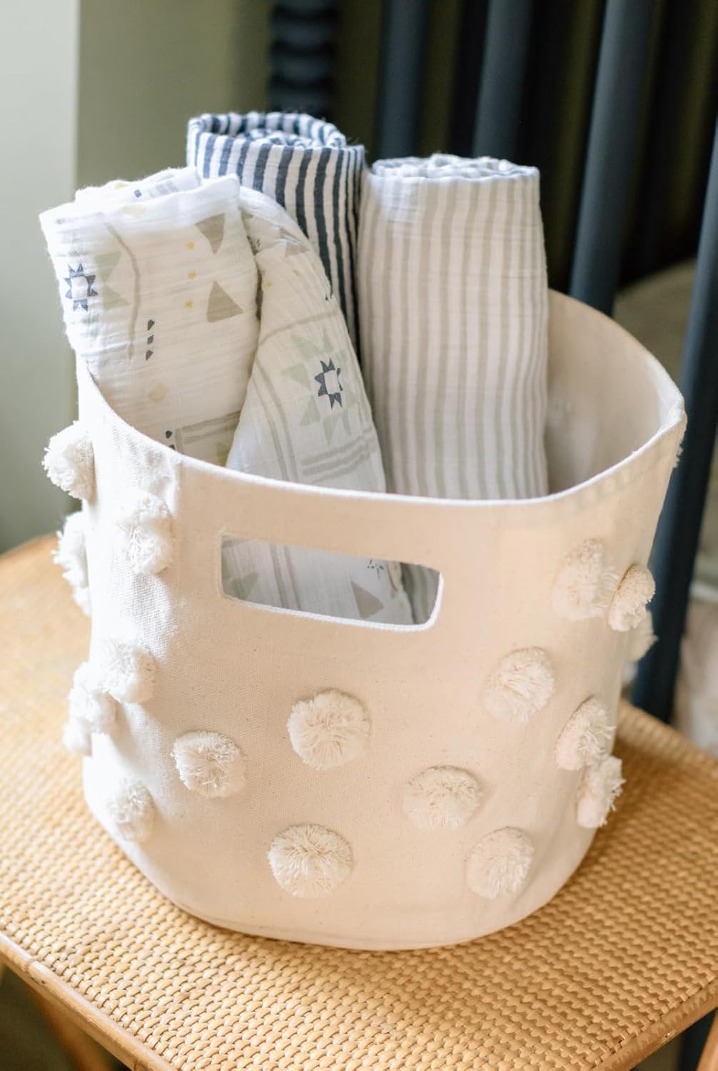 Declutter and update your decor with this durable cotton-canvas storage Pint that is perfect for diapers, creams and other small stuff! With each Pom Pom sewn by hand, It will add a pop of playfulness to any room.