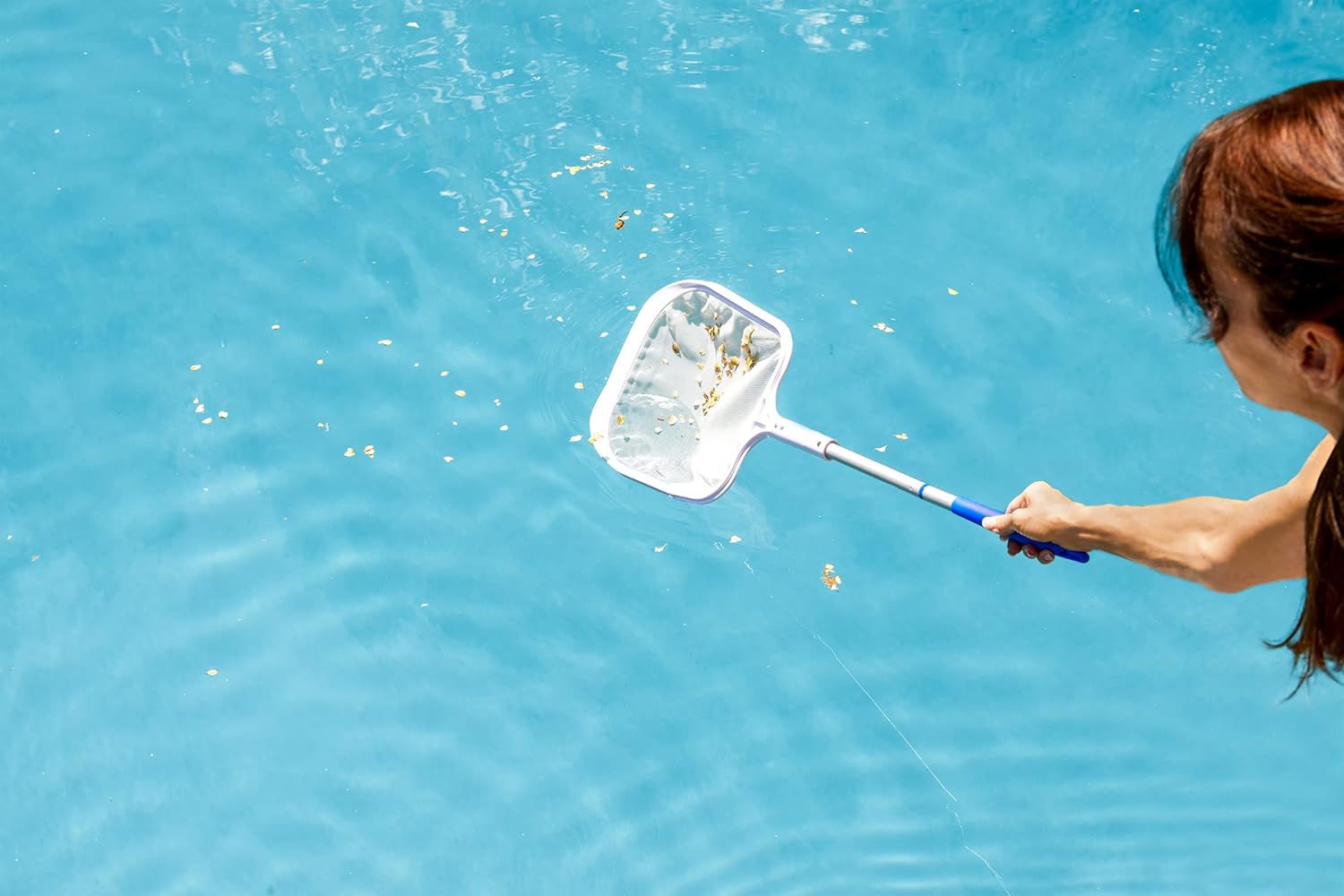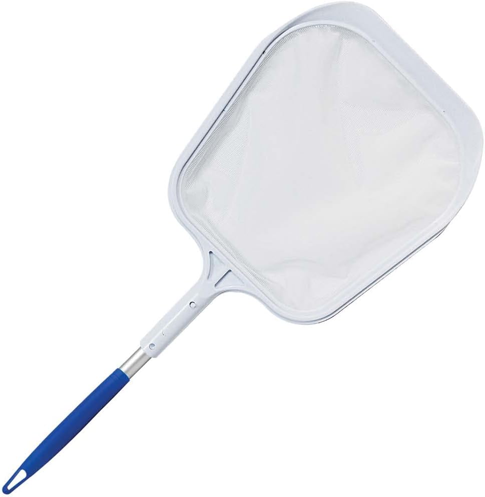 Don't let a long telescoping swimming pool pole get in the way of cleaning tight areas and smaller bodies of water. This pool water leaf skimmer with 2-piece pole set extends to almost 3-feet when fully assembled and allows you the reach where you need to remove leaves and debris floating along your pool, pond, spa, hot tub, fountain and more. The anodized aluminum and secure skimmer head features all-weather material for product longevity and durability. Pool skimmer's scoop-front feature allows for non-marring scraping of stuck-on leaves. This is a handy water feature and pool cleaning tool with a compact size that is easy to store.