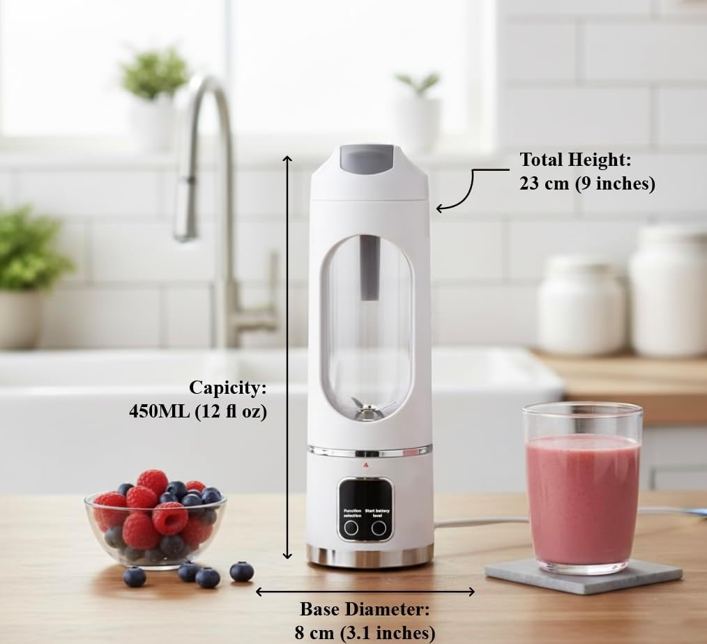 The Portable, wireless, personal Blender, mini mixer Blender, Smoothie make, USB, Rechargeable, with 12 smooth steel blades for smooth blending, 7.4V, 2-Speed option, 450ML capacity. White