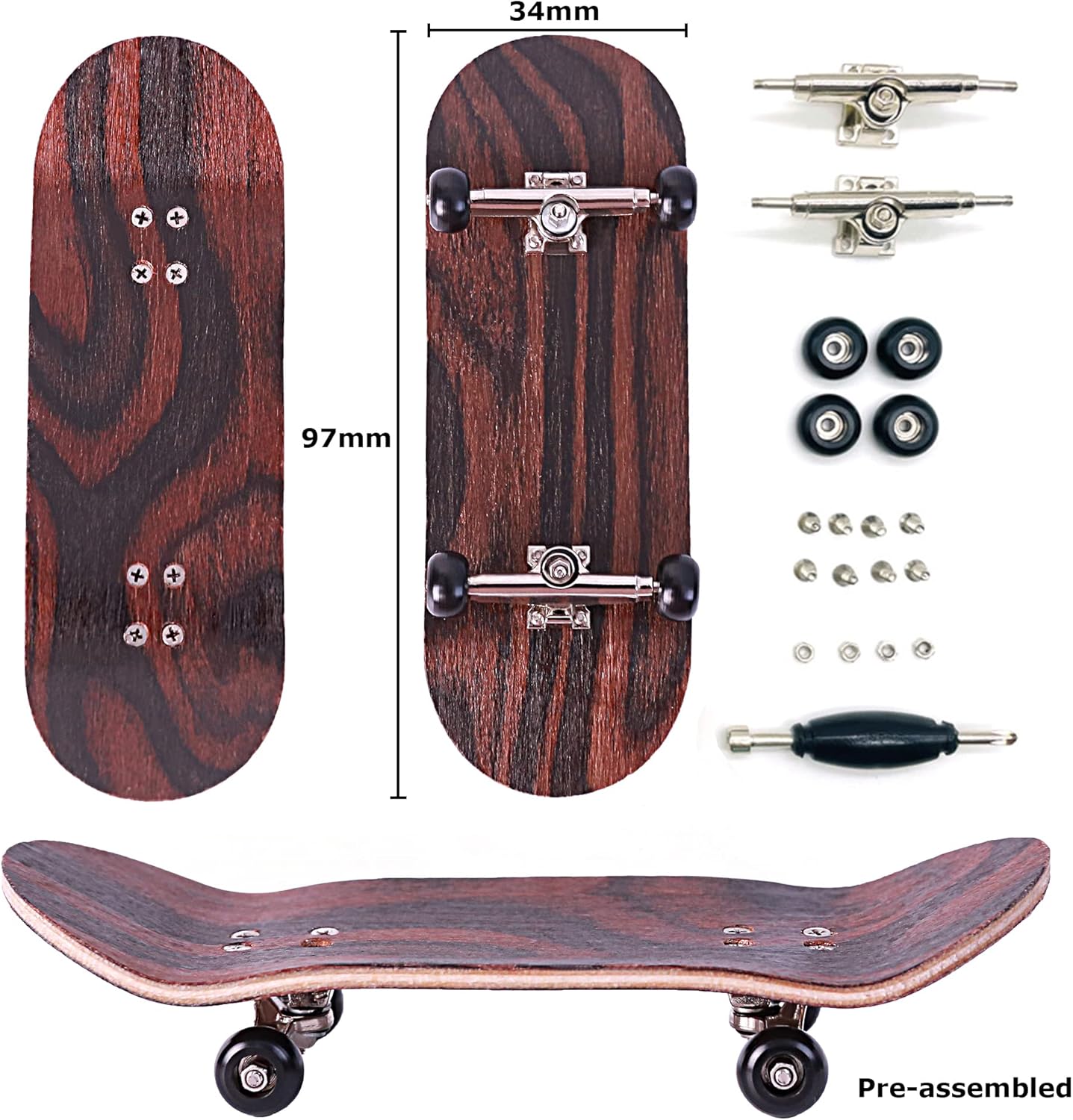 • FINGERBOARD KIT: The BRAVORD fingerboard package has everything you need, it includes 1 complete 5-ply maple 32mm/34mm deck, 4 pre-installed spherical wheels with bearings, 2 alloy trucks, 2 PU anti-slide pad, 1 mini screwdriver, 1 keychain ring, and 1 storage zipper case with hard shells.