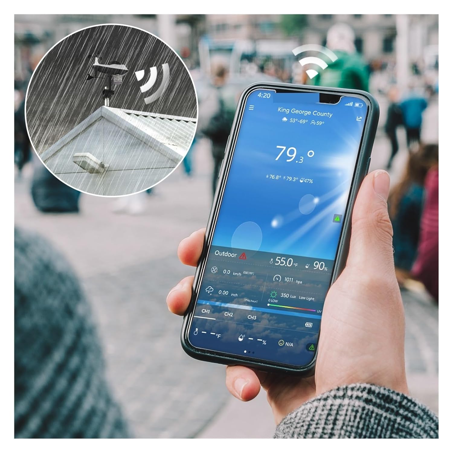 Function Overview 18 ALARM MODE A1: Rainfall prediction probability A2: Weather forecast A3: Value of wind speed A4: Wind direction steering wheel A5: Wind direction or wind top speed of 1Hr A6: Feels like temperature A7: Today's highest and lowest temperature record A8: Calendar A9: Day of the week A10: Time A11: Rainfall A12: Outdoor temperature A13: Outdoor humidity A14: Outdoor wireless channel A15: Indoor humidity A16: Indoor temperature A17: Air pressure and light intensity A18: UV index D1: Wind cups D2: North direction mark D3: Bubble level D4: Rain funnel rotation mark D5: Rainwater funnel D6: Lighting and UV sensors D7: Solar panel D8: Temperature | humidity induction box D9: Large nut for fixing the support rod and the base D10: Fixed base D11: Support rod D12: Socket head cap screws D13: Wind Directional Vane Network Weather Forecast After the weather station is connected to the WIFI hotspot, the weather information of the weather station will be automatically updated every hour after the weather forecast information obtained from the network. The weather station automatically downloads real-time weather data from the network, weather forecasts for the day and the next four days and forecasts for the highest and lowest temperatures. The weather station automatically uploads the meteorological data (temperature, humidity, air pressure, wind speed, rainfall, etc.) from the weather station to the server, and the APP can automatically download data from the server through the network. Pairing weather station device with smartphone Package details Weather Station Wireless Sensor Power Charger Mounting User Manual