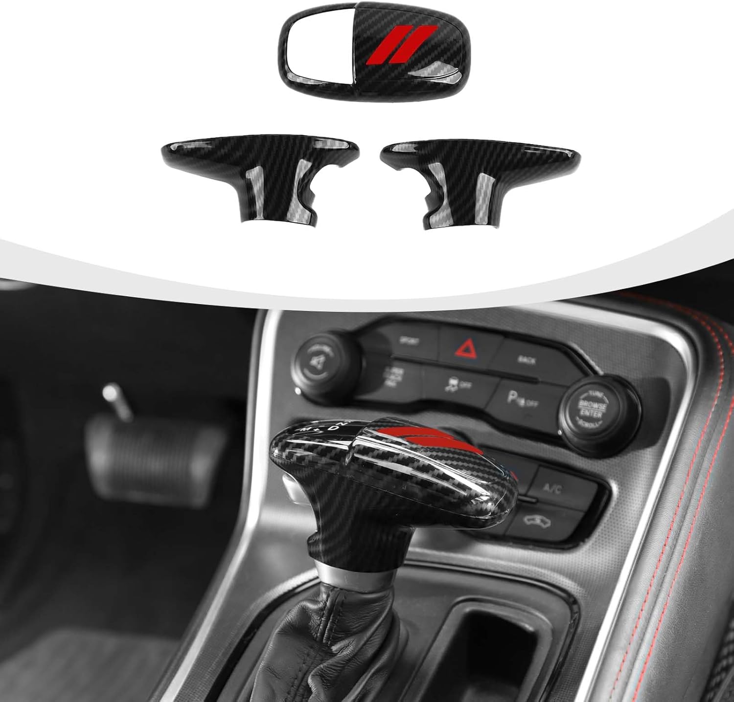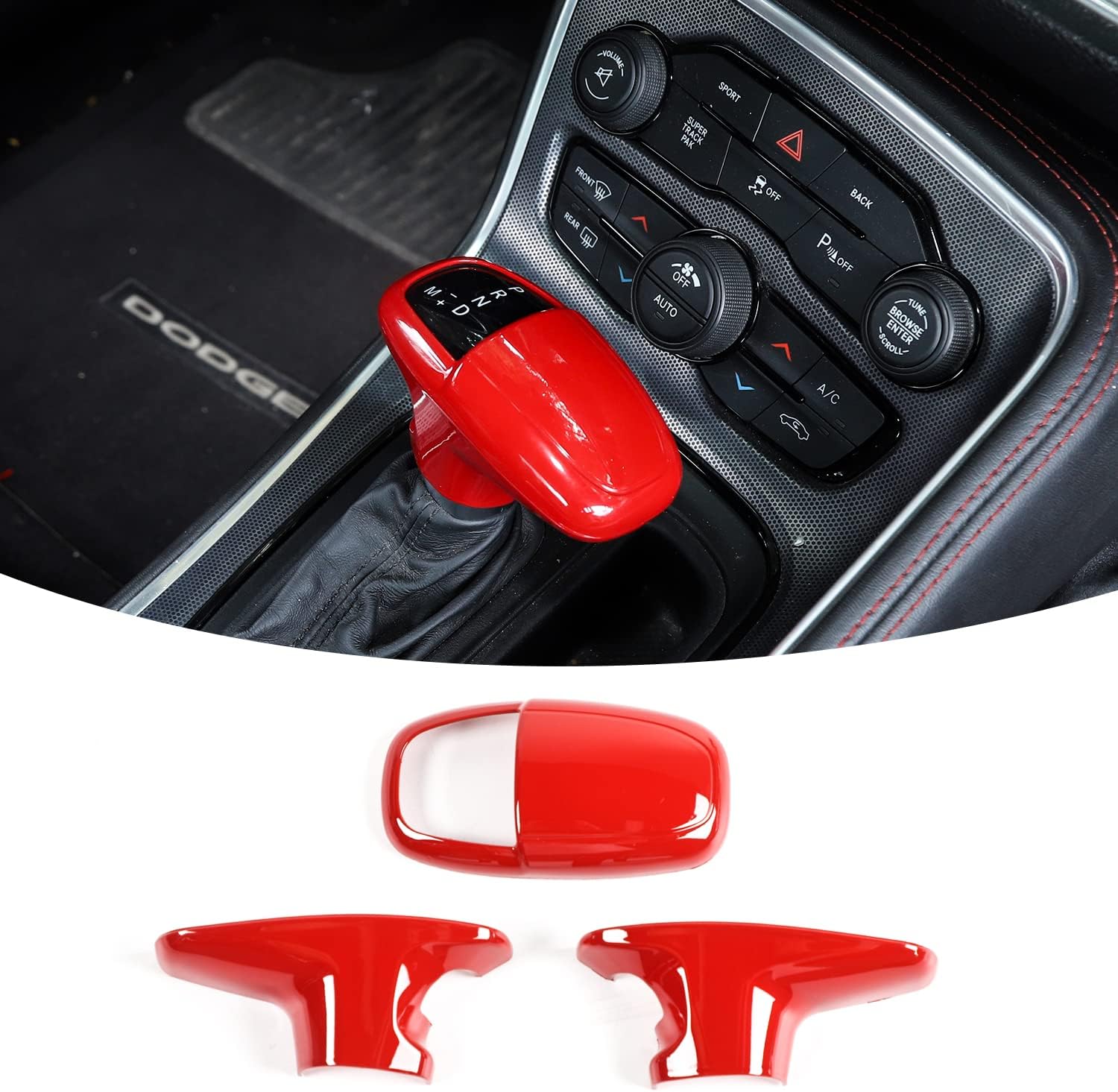 Model: -Gear shift knob trim fit for Dodge Challenger 2015-2022 -Gear shift knob trim fit for Dodge Charger 2015-2022 -Gear shift knob trim fit for Dodge Durango 2018-2022 Product Features: -Protects the gear lever from scratches. -Covers scratches and stains to make it like new. -Change a drab interior and make your car stand out. About Installation: 1. Using alcohol, clean the surface and keep it dry without water and dust. 2. It is best to heating the tape with hair dryer or baking gun, then tear off the double-sided tape behind it and stick it to the corresponding position. 3. Press firmly for a minute or so to better secure the lid in place. Attention: Before purchasing, please check your model and compare with the installation pictures.