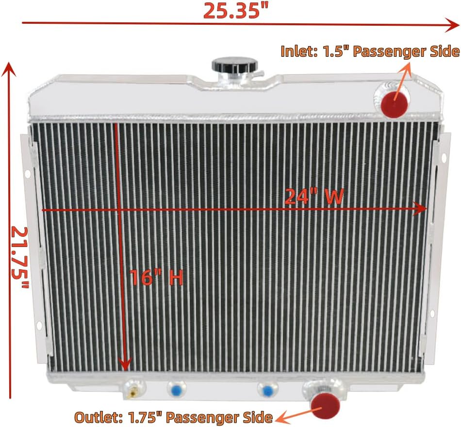 Package Include:1 X 4-Row AA5052 Aluminum Radiator1 X CNC Machined Radiator CapRadiator Size:High Performance Racing Spec.4-Row of tubes Core Racing DesignRadiator Flow: DOWN FLOWCore Width: 24.25''Core Height: 16''Overall Width: 25.375''Overall Height: 21.75''Inlet Diameter: 1.5''Outlet Diameter: 1.75''Upper Hose Fitting: PASSLower Hose Fitting: PASSTrans Cooler Details: 1/8-27NPTMounting Type: FLANGESMounting Specs: Vert -9 7/8 Horizontal - 24 5/8Vehicle Fitment:For 1968 Ford Mustang V8 4.7L Engine with AC or Heavy Duty CoolingFor 1968-1969 Ford Mustang V8 5.0L Engine with AC or Heavy Duty CoolingFor 1969 Ford Mustang V8 5.8L Engine with AC or Heavy Duty CoolingFor 1967-1968 Mercury Cougar V8 4.7L Engine with ACFor 1968 Mercury Cougar V8 5.0L Engine with ACFor 1969-1970 Mercury Cougar V8 5.8L Engine with ACAdvantages:1.Made from Aircraft AA5052 grade aluminum for prolonged lifespan and with raw aluminum finish2.Brazed core technology to guarantee optimum performance and dependability3.All AA5052 Aluminum 2mm thick tanks and fittings,Ensure it's hard and durable4.Ergonomic design CNC machined cap with Engraved craftsmanship, anodized treatment.5.OEM style brass petcock drain much better than other plastic ones.6.Carefully crafted to exceptional OE standards for a precise fit.