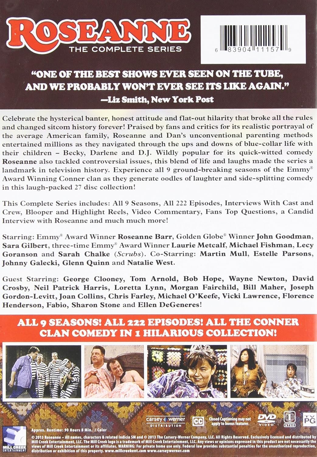 Celebrate the hysterical banter, honest attitude and flat-out hilarity that broke all the rules and changed sitcom history forever! Praised by fans and critics for it's realistic portrayal of the average American family, Roseanne and Dan's unconventional parenting methods entertained millions as they navigated through the ups and downs of blue-collar life with their children Becky, Darlene and D.J. Wildly popular for it's quick-witted comedy Roseanne also tackled controversial issues, this blend of life and laughs made the series a landmark in television history. Experience all 9 ground-breaking seasons of the Emmy Award Winning Connor clan as they generate oodles of laugher and side-splitting comedy in this laugh-packed 27 disc collection!