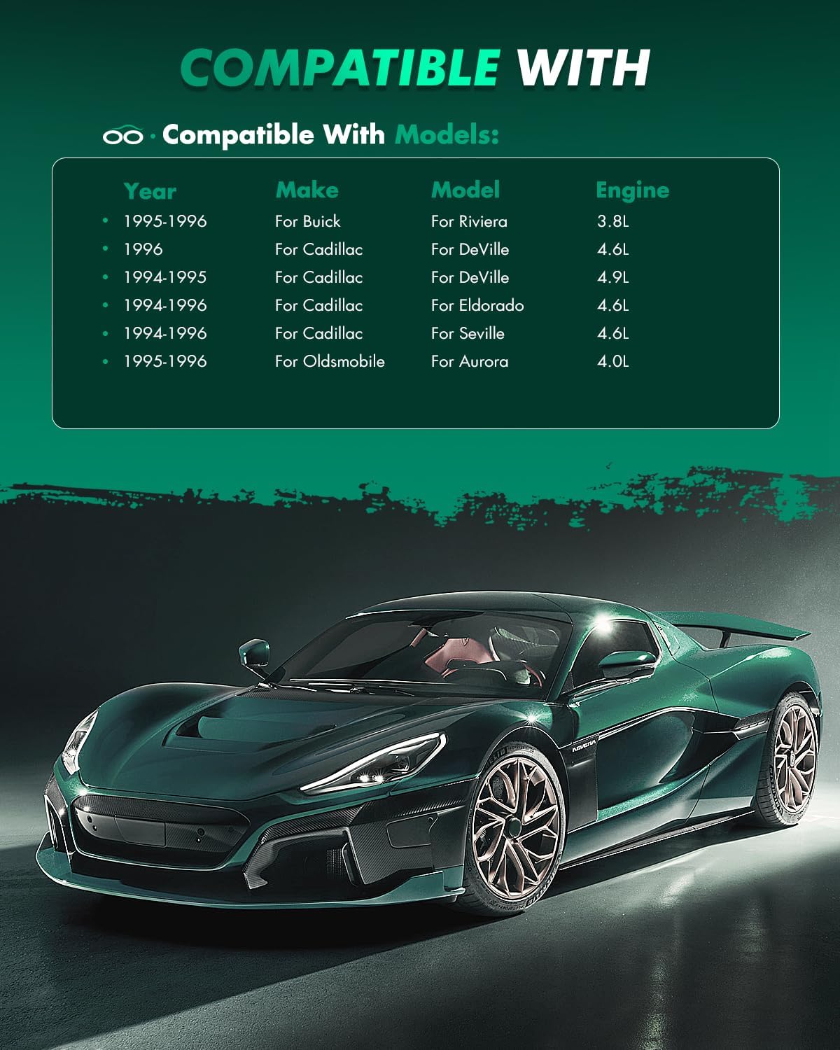Compatibility Information:For Buick Riviera Base Coupe 2-Door 1995-1996For Cadillac DeVille Base Sedan 4-Door 1994-1996For Cadillac DeVille Concours Sedan 4-Door 1994-1996For Cadillac DeVille d'Elegance Sedan 4-Door 1996For Cadillac Eldorado Base Coupe 2-Door 1994-1996For Cadillac Eldorado Base Sedan 2-Door 1995-1996For Cadillac Eldorado ETC Coupe 2-Door 1995-1996For Cadillac Eldorado Touring Coupe 2-Door 1994For Cadillac Seville Base Sedan 4-Door 1994For Cadillac Seville SLS Sedan 4-Door 1994-1996For Cadillac Seville STS Sedan 4-Door 1994-1996For Oldsmobile Aurora Base Sedan 4-Door 1995-1996