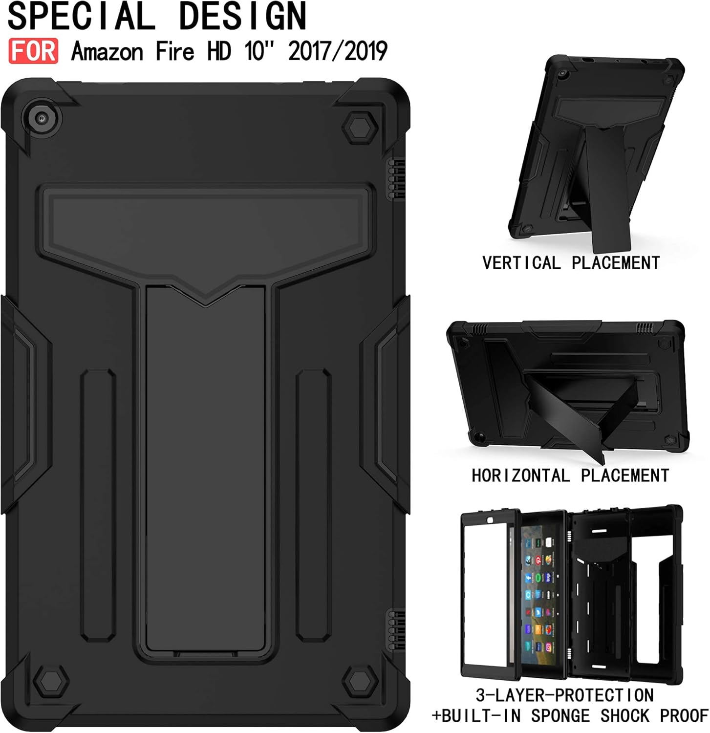 ✪✪✪ Heavy Duty Shockproof Case for Kindle Fire HD 10.1" Tablet (7th/9th Generation, 2017/2019 Release), Built-in Kickstand (Landscape + Portrait View) ✪✪✪ Compatibility: ✔ Kindle Fire HD 10 9th Generation, 2019 Release ✔ Kindle Fire HD 10 7th Generation, 2017 Release * Will not work for any other Fire 10.1" version, please choose the correct model before purchasing. Features: * Rugged anti-slip design, shows practical yet classy shape. * Precisely engineered to fit your device while leaving all ports and buttons easily accessible. * Raised bezel reduces the chance of damage to the screen and camera when facing down. * 3-in-1 hybrid shock absorption case cover combines hard PC interior and soft silicone exterior that protects from bumps, drops and scratches. * The built-in T-shaped kickstand is perfect for FaceTime and watching videos; idea for school and classroom tasks, outdoors and kids friendly, sturdy and easy to carry. Package List: 1 x Kids Protective Case for Amazon Fire HD 10 Tablet (7th/9th Generation, 2017/2019 Release) 1 x Stylus Pen (random color) 1 x Cleaning Cloth If you have any question about our product, please contact us by email.