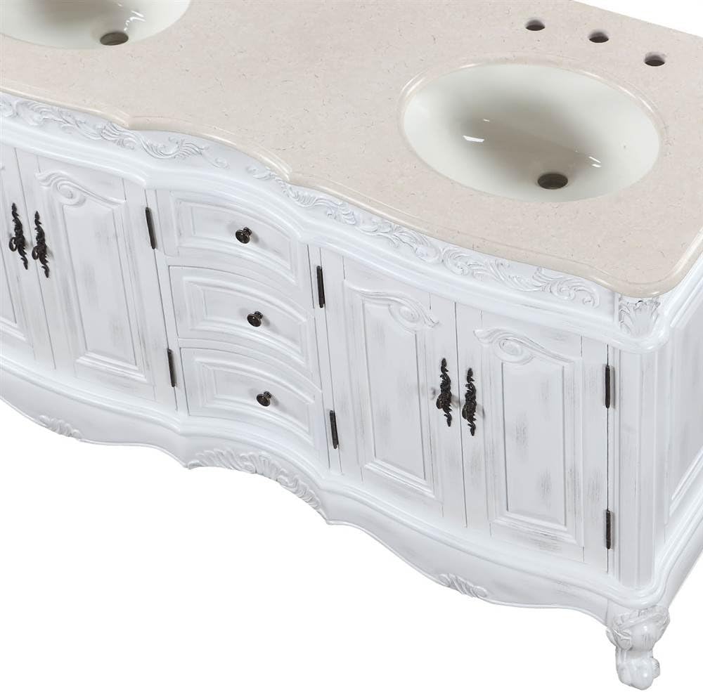 Bring appeal to your bathroom with this elegant Empire style double sink vanity. This bright and charming traditional piece features our rich White Oak wood finish, ample storage room for you to organize all of your bathroom necessities & accessories, complementary Antique Brass handles, our all natural solid Cream Marfil Marble Stone Counter top with holes pre-drilled (3 per sink) to accommodate any standard 8-inch widespread faucet of your choice, Spanish scroll feet to support the sturdy frame and beautiful carvings throughout the cabinet to accentuate the steadfast profile.