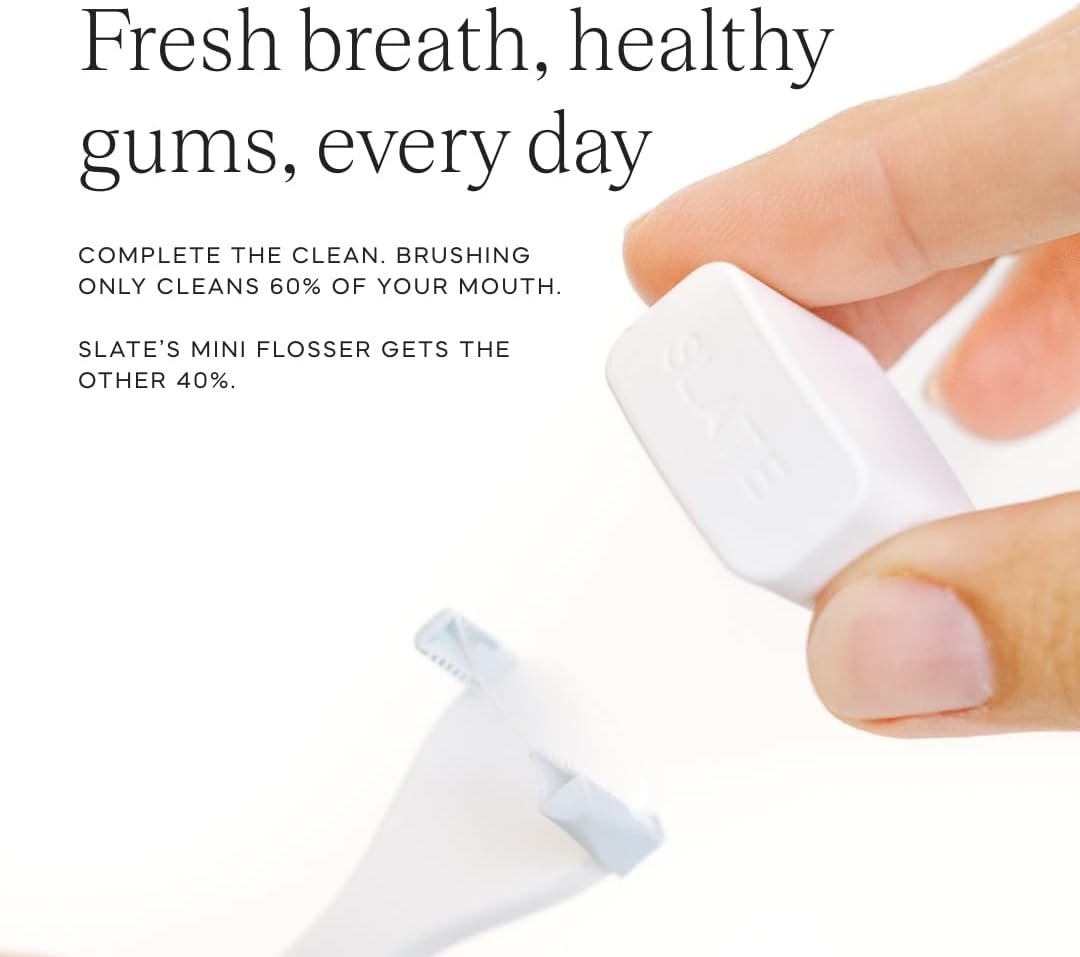 Flossing with braces shouldn’t feel impossible. The Slate White Mini Flosser + Braces Bundle includes two White Mini Flossers and a full 20-pack of orthodontic floss head refills designed specifically to clean under wires and around brackets—without the frustration of traditional floss threaders. Each braces floss head features Slate’s patented 3-in-1 design: slim woven floss that easily slides where string floss struggles, soft gum brushes that massage and stimulate gums, and a built-in tongue scraper to help fight bad breath. The result is a more effective, gentler clean that makes daily flossing easier to stick with—even for kids and teens. Designed by a dentist and made for real life, this bundle is ideal for orthodontic care at home, school, or on the go. Fewer skipped floss days, healthier gums, and cleaner teeth throughout treatment.