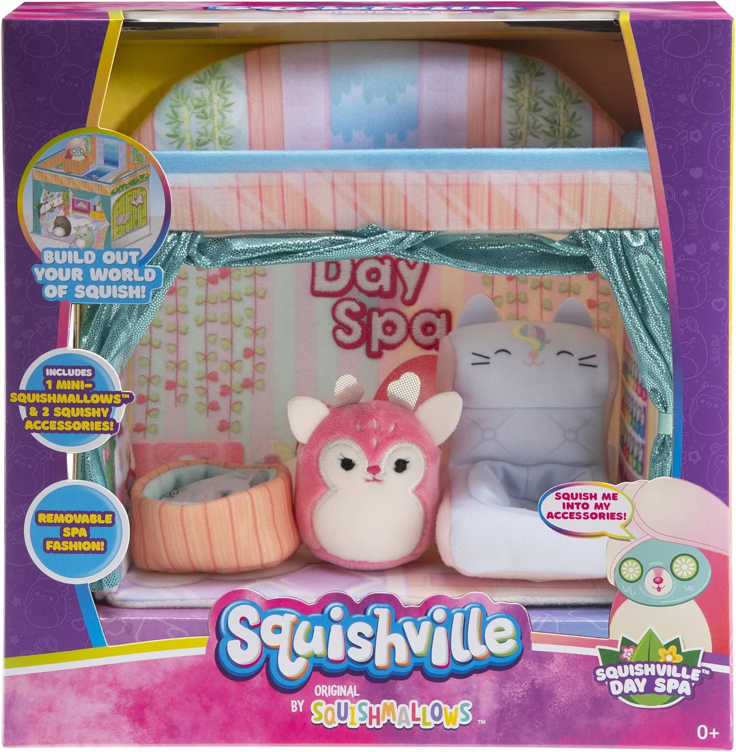 Treat yourself to some rest and relaxation with the Deluxe Day Spa! Featuring a 2-inch Duchess the Pink Deer, two accessories, fashion, and a Spa Resort Playscene, this calm corner is the perfect refuge from your routine hustle and bustle. First, join Duchess for a Towel Wrap and Face Mask to decompress. Then, place her in the Basin to soak inside a steamy bath. Explore the Spa Resort Playscene and don’t forget to sit her down in the Mani-Pedi Lounge Chair to top off her perfect day. Collect this Squishville Playscene and look out for more coming soon!