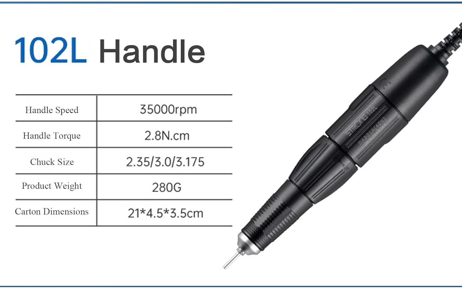 Product Name: STRONG209K 65W Micromotor PolisherModel: STRONG 209KPower: 65WInput Voltage: 110VFrequency: 50Hz/60HzRotational Speed: 0-45,000 RPMHandle: 102/102L (Micro Motor Handle)Applications: Jade carving, wood carving, stone carving, nail art, micro carving, polishing, and more.Features:The STRONG209K 65W Micromotor Polisher is a professional-grade tool engineered for fine grinding, carving, and polishing, delivering the precision required for delicate tasks.With a high-speed rotation of 45,000 RPM and exceptional concentricity, this micromotor polisher ensures ultra-smooth, detailed results across various materials.Compact and lightweight, the micromotor marathon design is easy to transport and operate in diverse working environments, significantly improving workflow efficiency.Instructions:Avoid frequent changes in rotation direction to prevent damage to the grinding head.Before turning off the device, rotate the speed control counterclockwise to reduce the grinding head speed to the minimum, then switch the main power to "0".After use, place the grinding head on the top panel for organized storage.When adjusting speed, do not press the right switch button; wait until the handle stops completely before pressing.For extended idle periods, disconnect the power source to ensure safety and prolong tool life.