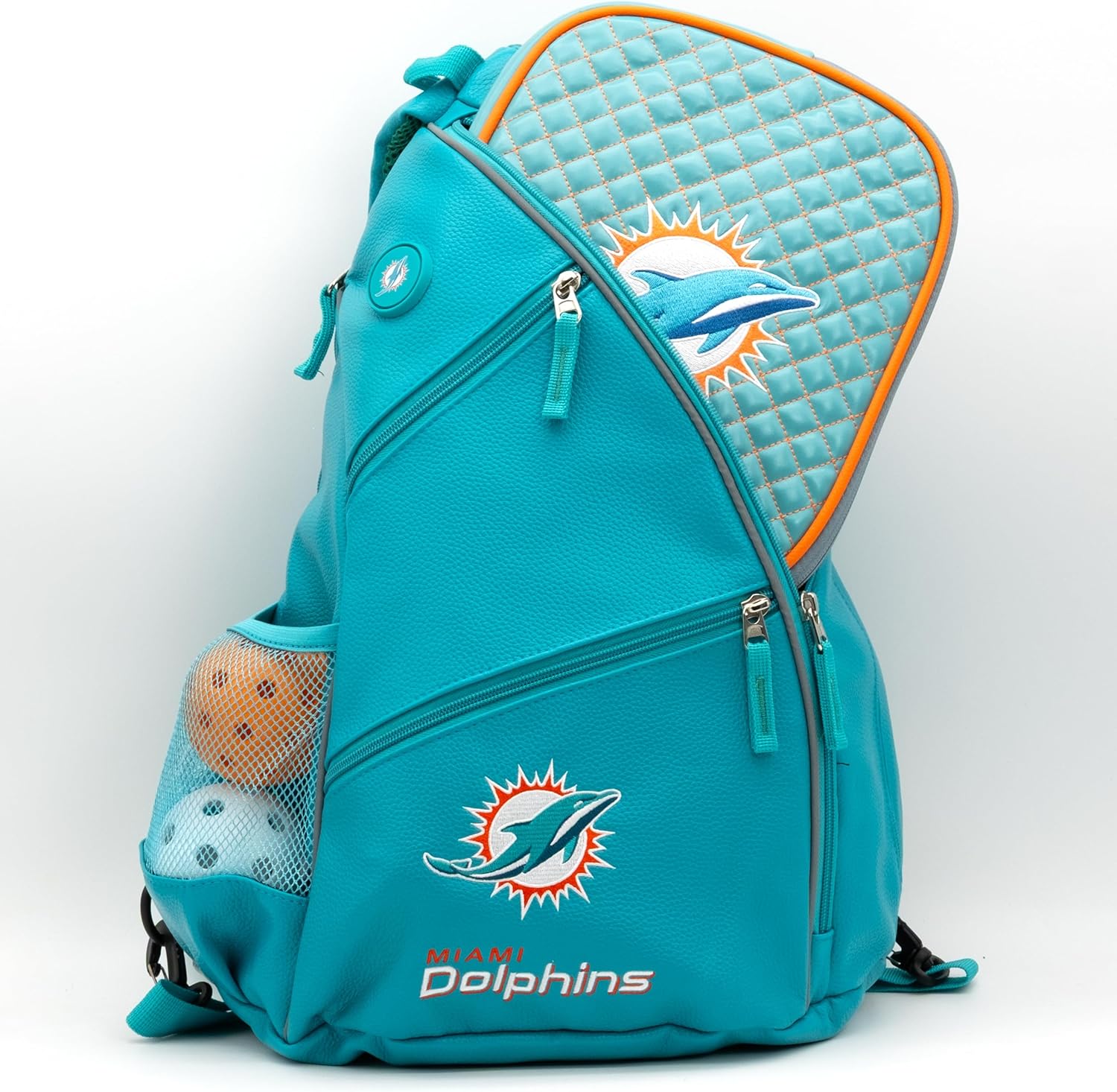 The PU Leather Embroidered Team Backpack features a magnetic towel catch, five zippered pockets and four internal mesh pockets, water bottle pocket and ergonomically designed straps for shoulder or cross-body carry.