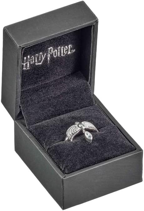 Official Harry Potter Sterling Silver Diadem Ring size small It is said Rowena Ravenclaw stole the Diadem from her mother as she envied the attention she received when wearing it. This Sterling Silver Diadem ring is sure to draw attention, especially worn with the necklace and earrings in this collection. The delicate diadem is finished with pale blue crystals and has a moveable drop tail feather. The diadem is approx. 1.5cm wide and the ring is available in sizes S (ring size J) ,M (ring size M), L (ring size P) Made from Sterling Silver with crystal detailing and comes boxed in Official Harry Potter branded packaging.