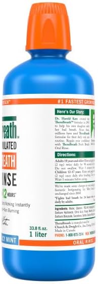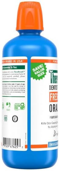 Bad breath is nothing to be ashamed of...everyone gets it! ADA accepted TheraBreath Fresh Breath Mouthwash has been fighting bad breath for over 25 years. When used as directed, it's clinically shown to fight bad breath for 24 hours when used every 12 hours after brushing and flossing. This alcohol-free mouthwash doesn't burn or irritate, and the oxygenating compound that fights bad breath starts working instantly. TheraBreath Icy Mint Mouthwash for Adults has no artificial dyes and is certified kosher, vegan, and gluten-free. We’re so confident in the effectiveness of TheraBreath Oral Rinses that we back them up with our 100% guarantee. If you haven’t seen improvement in your breath, contact us within 30 days of purchase for a full refund. TheraBreath: It's a better mouthwash, satisfaction 100% guaranteed!