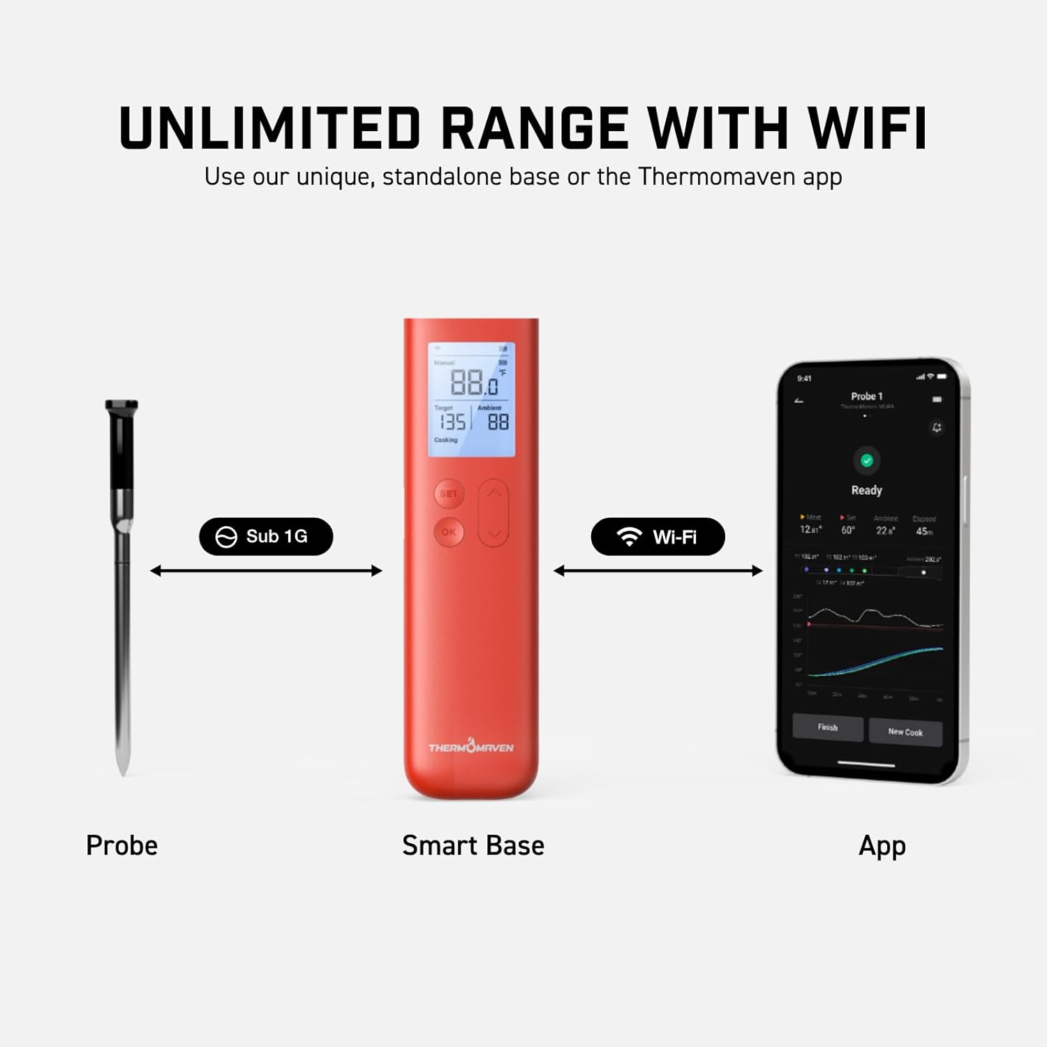 ThermoMaven Wireless Smart Meat Thermometer guarantees perfect cooking with Sub-1G wireless technology, ensuring stable connections and a remarkable 3000-foot range. With NIST-certified accuracy of ±0.5°F, it can be operated via the base unit or the companion app. Ideal for grilling, baking, smoking, and rotisserie cooking.