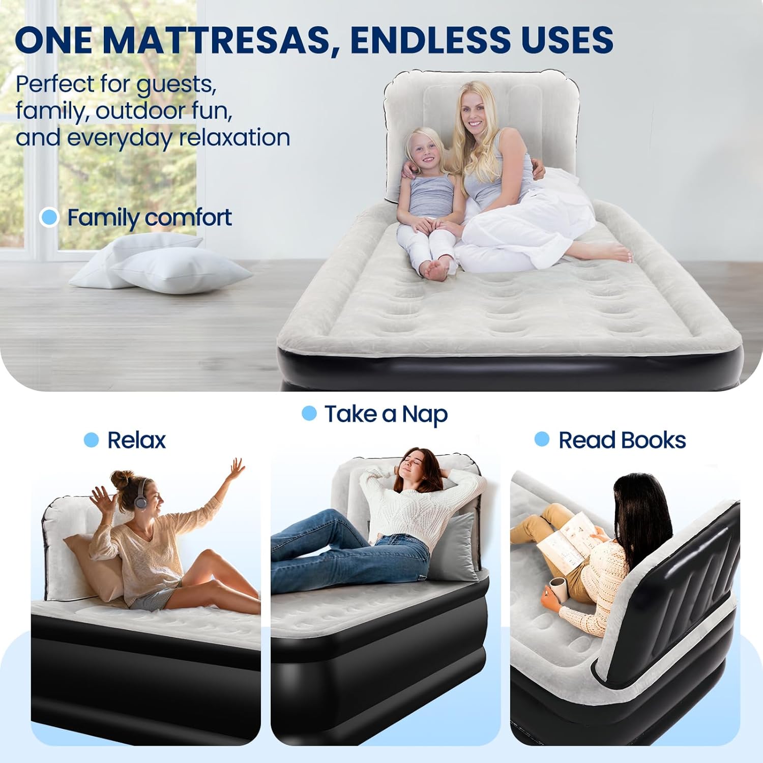 | Product Benefits | Easy inflation/deflation with built-in pump, Headboard for comfort and support, Durable puncture-resistant PVC, Leak-tested for airtightness |