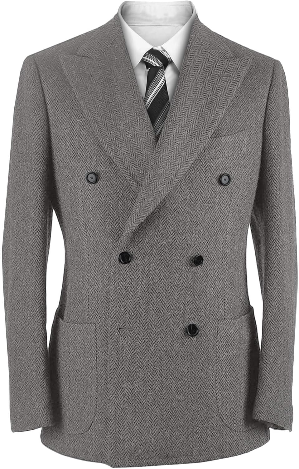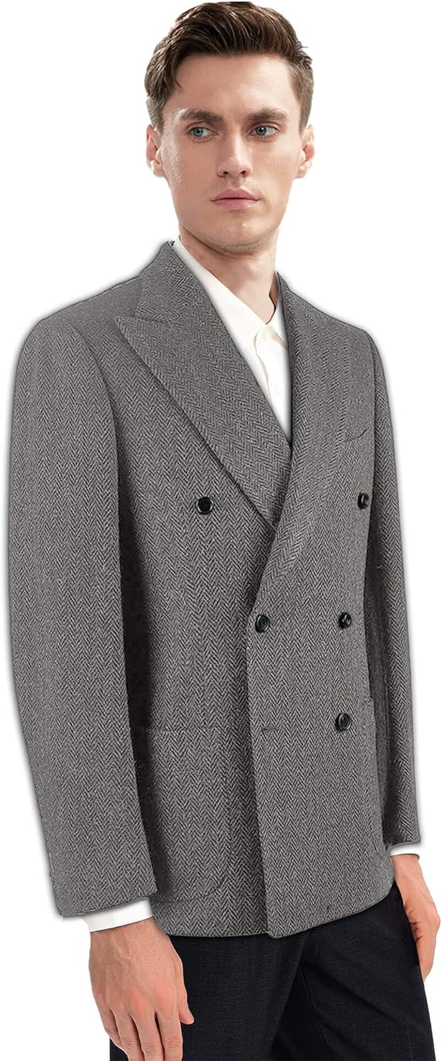 Vintage Herringbone Tweed Sport Coat British Peak Lapel Woolen Blend Tuxedo Jacket with Pockets Fabric: 90% Polyester, 8% Woolen & 2% Viscose Feature: Peak Lapel/ Doble Breasted/ 6 Buttons/ 1 Chest Pocket/ 2 Patch Pockets/ 2 Inner Pockets/ 4 Cufflinks/ Long Sleeve/ Double Vents This collection includes: 1 x Blazer (Any accessories aren't inclued) Custom Size Guide Refer to Our Merchant size chart before you buy. If you can't find a suitable size, please send us your detail measurements as following: 1:neckline=___'' 2:shoulder width=___'' 3:sleeve length=___'' 4:armhole (bicep)=___'' 5:cuff=___'' 6:chest=___'' 7:belly=___'' 8:height =___'' 9:weight=___lbs Warm Prompt * Take the sewing thread apart when you receive the clothes, if it's necessary. The pockets are real. * Wash Instruction: Dry cleaning is recommended if conditions permit, and if hand washing is necessary, keep the water temperature below 40 degrees and wash gently. Hang on hangers for storage do not fold, No Bleach, Low iron and tumble dry on low heat. * There is a certain color difference due to the different resolution of computer display, thanks for your understanding. Department:mens winter sport coat, slim fit sport coat, herringbone blend for men, casual blazer for men, blazer jacket for men, suit jacket for men, blazer for men regular fit, blue blazer for men big and tall, mens twill blazer