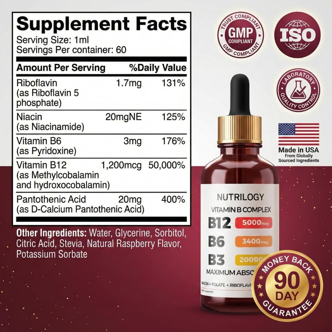 Nutrilogy Vitamin B-12 Complex delivers targeted support for nerve health, mental clarity, and sustained energy through a fast-absorbing liquid formula. Each full dropper provides clinically dosed active B-vitamins in methylated forms, ensuring superior absorption compared to standard supplements. This advanced formulation helps relieve tingling and numbness while combating brain fog and supporting healthy nerve function. The liquid delivery system allows for rapid absorption, making it ideal for those seeking quick results. With 60 servings per container, this B-12 complex supports mood enhancement, sharpens focus, and provides a natural energy boost without jitters. Every batch is third-party tested for purity and potency, ensuring you receive a high-quality supplement you can trust. Whether you're dealing with occasional fatigue, difficulty concentrating, or nerve discomfort, this comprehensive B-vitamin formula targets multiple aspects of neurological and cognitive wellness in one convenient daily dose.