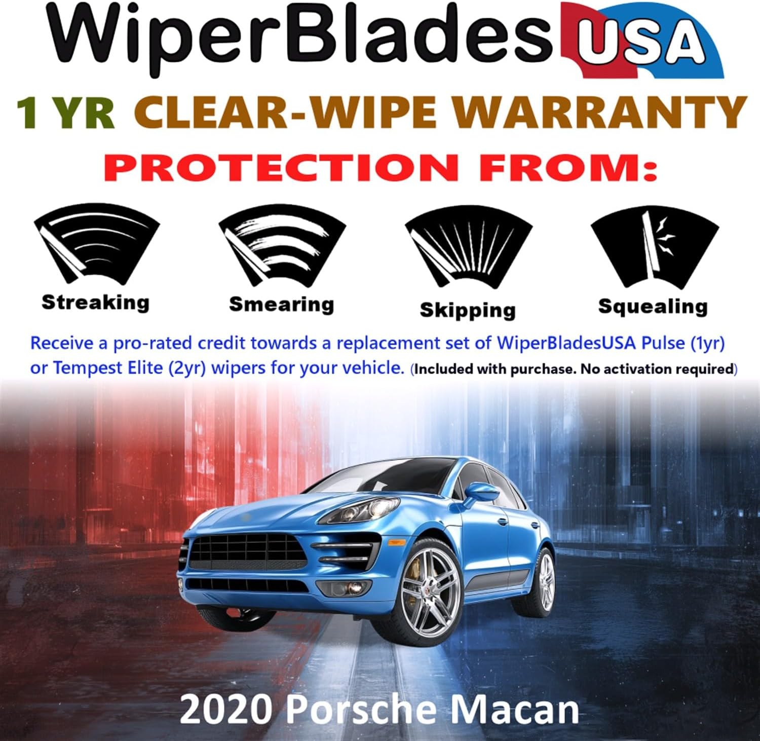 2020 Porsche Macan Pulse Beam wiper blades wipers set +Trico ExactFit Rear wiper. Guaranteed to fit your 2020 Porsche MacanWiperBladesUSA Beam Wiper Blades - Durable Flexible Beam Blade These WiperBladesUSA® beam wiper blades contours to the curvature of your windshield to provide even wiping pressure along the full length of the blade. These wiper blades have a 1 year Wiper Wear Warranty included. Meaning if they stop keeping you safe you get a credit towards a fresh pair. (See Details) When WiperBladesUSA says "We Got You" we want to make sure you keep good working wipers on your car. Every day. All the time. The beam wiper wiper blade is designed to be compatible with your 2020 Porsche Macan Virtually streak-free visibility Great wipers to have in rain, sleet and snow1 year "Clear-Wipe Warranty"Smooth, chatter-free wipe is a result of the specially blended teflon rubber bladeEnhanced flexibility and grip from the durable, rubber-encased substructureSignificant noise reduction and wind lift through a built-in aerodynamic spoiler to keep the wiper on the windshield at freeway speedsAll weather tough wiper blades with a synthetic rubber squeegee that will withstand even the most extreme weather conditionsPrevents ice and snow build-up through the elimination of exposed metal components. Easy Installation: Included in the bundle is directions (w/video) to simple and easy to use step-by-step installation on to your 2020 Porsche Macan