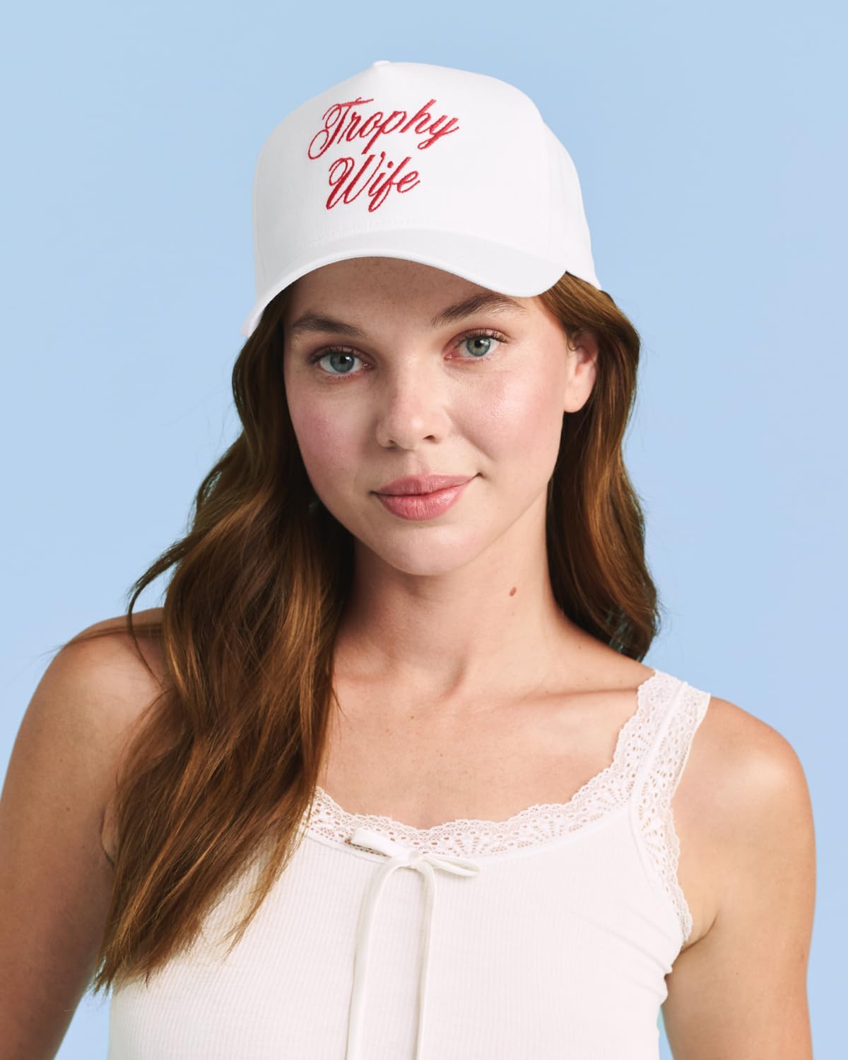 PSA: Your trophy wife era just got a signature hat. This white trucker serves a clean, iconic look with bold red embroidery, an adjustable snapback, and breathable cotton for all day comfort. Wear it for bachelorette plans, bridal shower photos, wedding weekend errands, or honeymoon airport daily selfies. Style with denim or a silky mini and call it your uniform. Instant confidence, endless compliments, zero effort. Put it on, claim the crown, and remind the world exactly who you are, bestie - then strut, smile, slay.