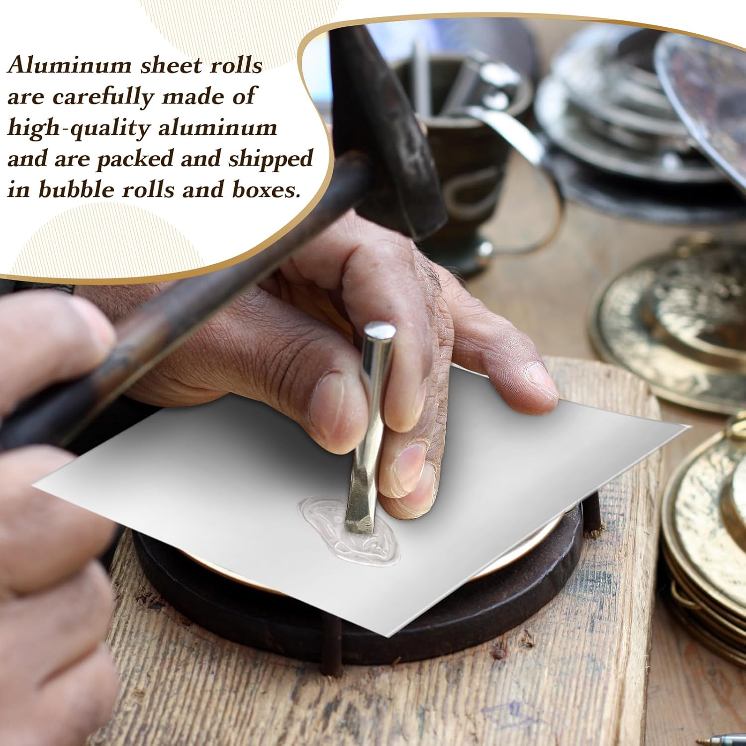 Features: Aluminum sheet metal roll becomes the practical companion for DIY enthusiasts and those who frequently engage with decoration projects. You will have ample supply of metal sheets for crafting to meet your daily crafting needs, and you can share these craft aluminum sheets with family or friends Specifications: Material: aluminum Color: silver Size: about 6 Inch x 6 Inch x 0.07 mm Package includes: 150 x Aluminum metal foil Notes: Manual measurement, please allow slight errors on size. The color may exist a slight difference due to different screen displays. It can be cut with household scissors, please use gloves when handling