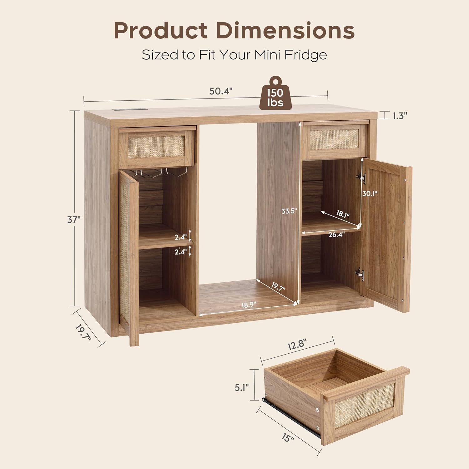 | Additional Features | Built-in power outlet for convenience, Double doors with soft-close hinges, Fits mini fridge up to 4.5 cu ft, Long vertical solid wood handles, Two side drawers for extra storage |