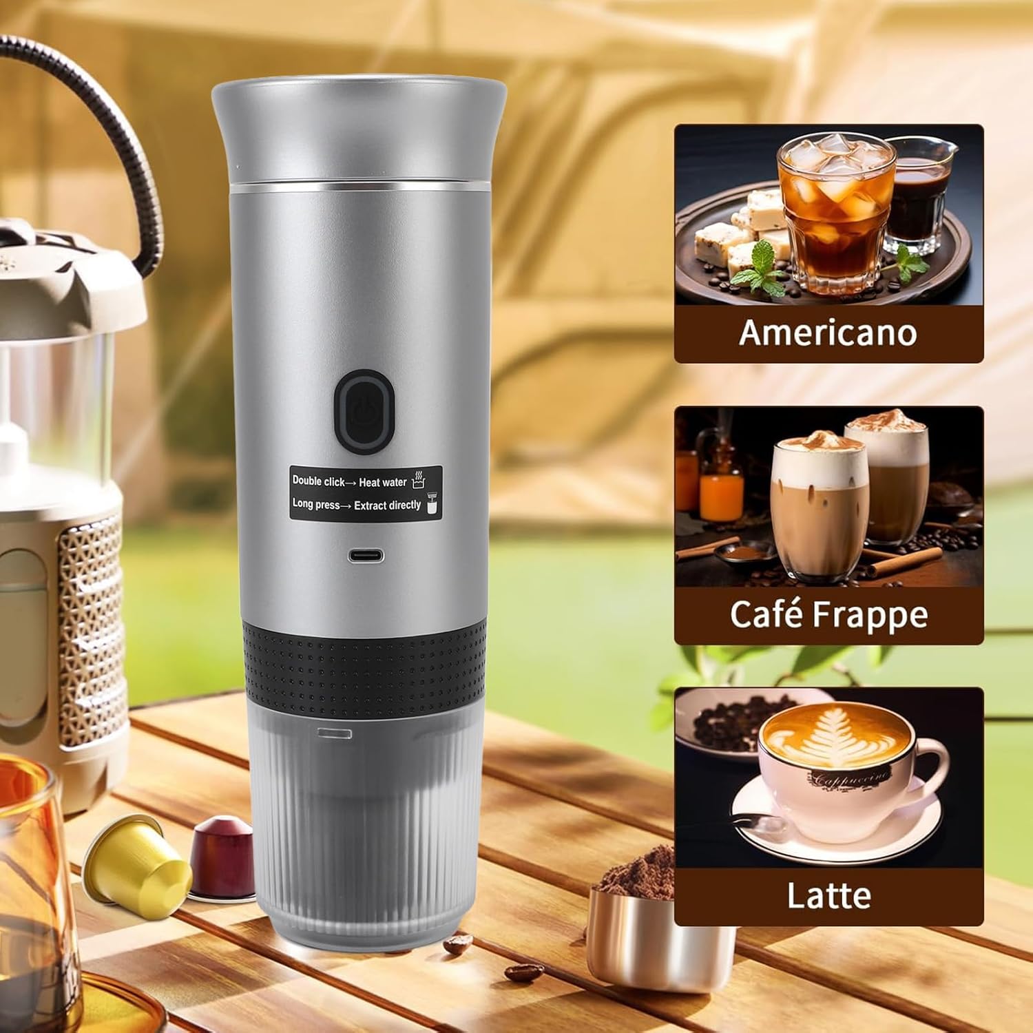 1. Portable and Lightweight: Lightweight and compact, this mini coffee maker is constructed from 304 stainless steel and ABS, easy to disassemble and maintain, portable for daily use. 2. Automatic Heating: The travel coffee machine allows water heated to ideal temperature in just 5 minutes. Brew rich, foamy coffee in 3 to 5 minutes, reducing your waiting time. 3. Long Battery Life: Built in 7500mAh rechargeable battery, the portable coffee maker supports car and USB charging. Brew 5 cups with cold water, over 200 cups with hot water. 4. High Performance: One button operating, the travel coffee machine brews hot or iced coffee in minutes. Leakage proof, insulated design. Includes reusable cup, filter, holder, and easy to clean components. 5. Wide Application: The camping coffee machine is suitable for travel, camping, hiking, RV trips, can also be an ideal present for your families and friends. Spec: Item Type: Portable Coffee Maker Material: ABS+304 Stainless Steel+PC Power: 72W Coffee Cup Capacity: 120mL Brewing Time: 5min Extraction Time: 60s Water Heating Temperature: 86℃ Dry Boiling Temperature: 145℃ Weight: Approx. 792.00g / 27.94oz How to Use: USB charging, press the switch to start working. Package List: 1 x Coffee Machine 1 x User Manual 1 x Spoon 1 x USB Cable 1 x Compartment (Built in)