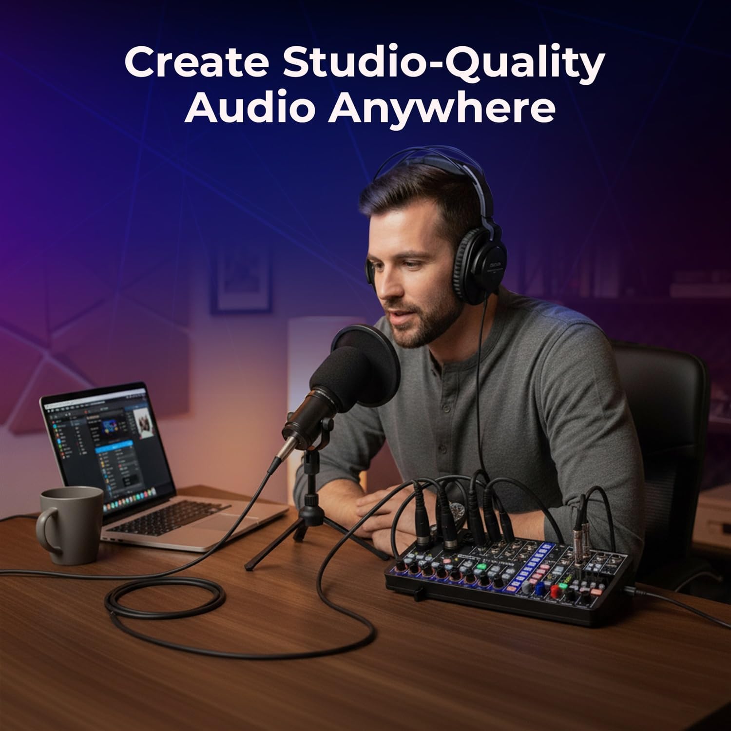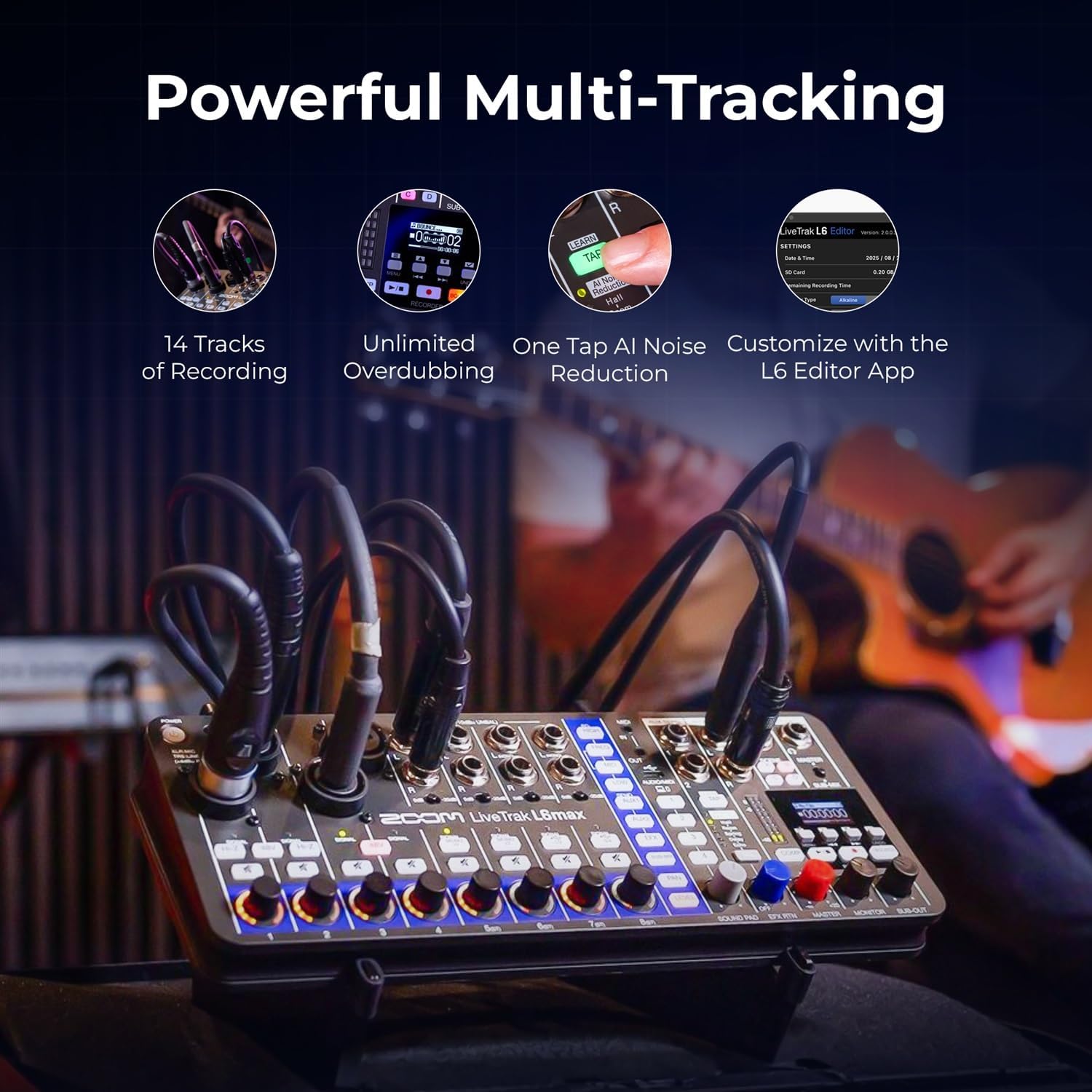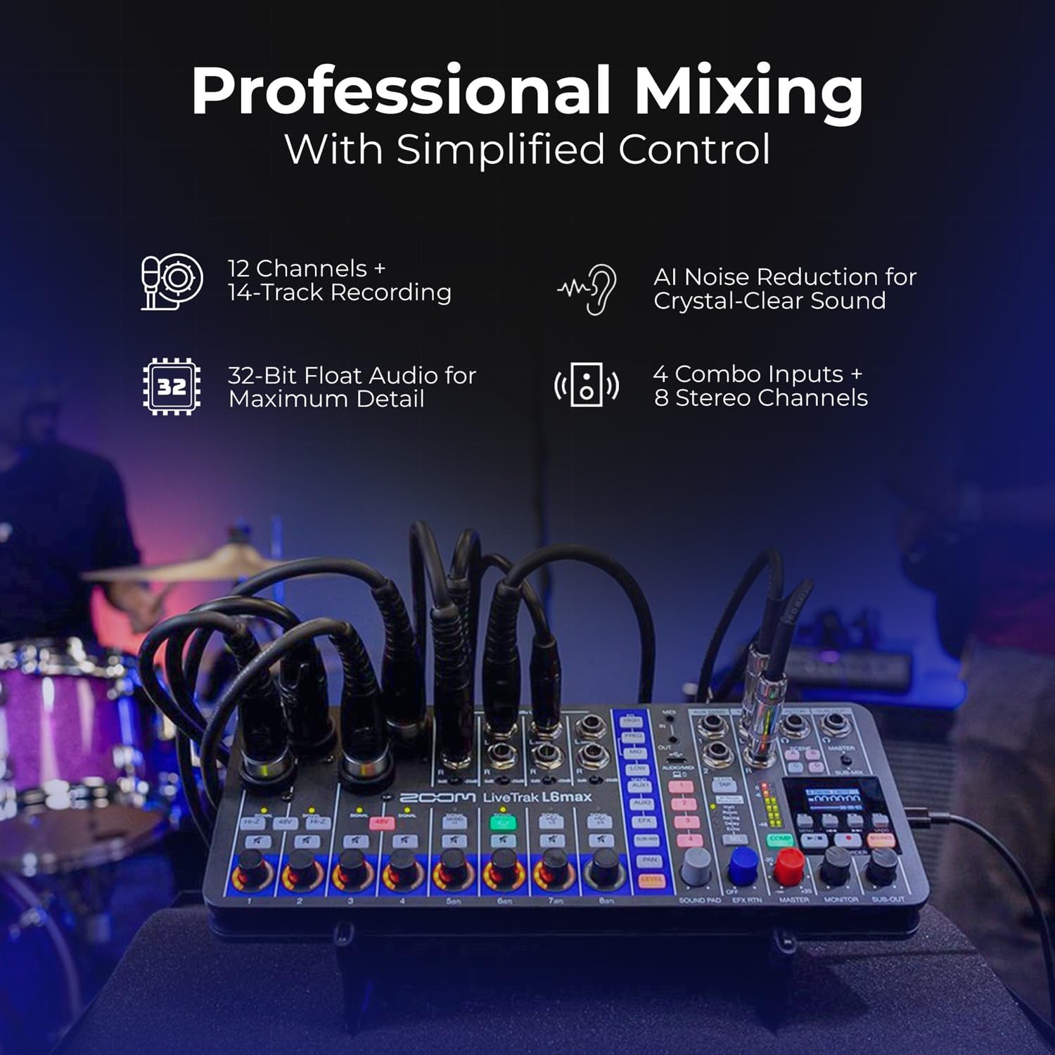 Purpose-built for producing polished multi-person podcasts anywhere you go, the Zoom PodTrak P4 is a cost-effective portable multitrack podcast recorder that lets you quickly record up to four mics, handle 2 echo-free remote call-ins simultaneously, trigger sound samples, and provide separate headphone feeds for all your guests, all at the same time and with refreshing simplicity. From the intuitive, tactile controls to the plentiful battery life and powerful audio processing functions, the PodTrak P4 is well equipped to help you record or stream pristine audio for panel podcasts. Dynamic and condenser mics, customizable sound pads, call-ins via your smartphone or computer, and independent headphone outs; the PodTrak P4 can manage everything you need a podcast production station to do. Extra touches, including built-in limiters and low-cut filters to enhance your tracks, an integrated mix-minus function to prevent echo and feedback for remote guests, and multiple power supply options, make the PodTrak a truly powerful all-in-one solution for podcasting. Bundle includes: ● 1× Zoom LiveTrak L6max Digital Mixer/Recorder ● 1× Zoom ZDM-1 Podcast Mic Pack ZDM-1 Dynamic Microphone ZHP-1 Closed-Back Headphones Adjustable Tabletop Mic Stand XLR Microphone Cable Foam Windscreen ● 4× AA Batteries ● 2× 64GB microSDXC Memory Cards ● 1× Premium Microfiber Cleaning Cloth (Black) Covered by Manufacturer’s Warranties